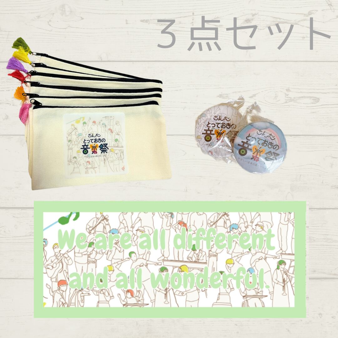 このグッズ3点セットは、オリジナルポーチ、オリジナル缶バッジ、オリジナルタオルが含まれており、日常を彩るアイテムが満載です。
